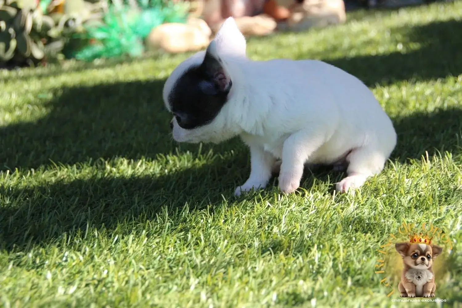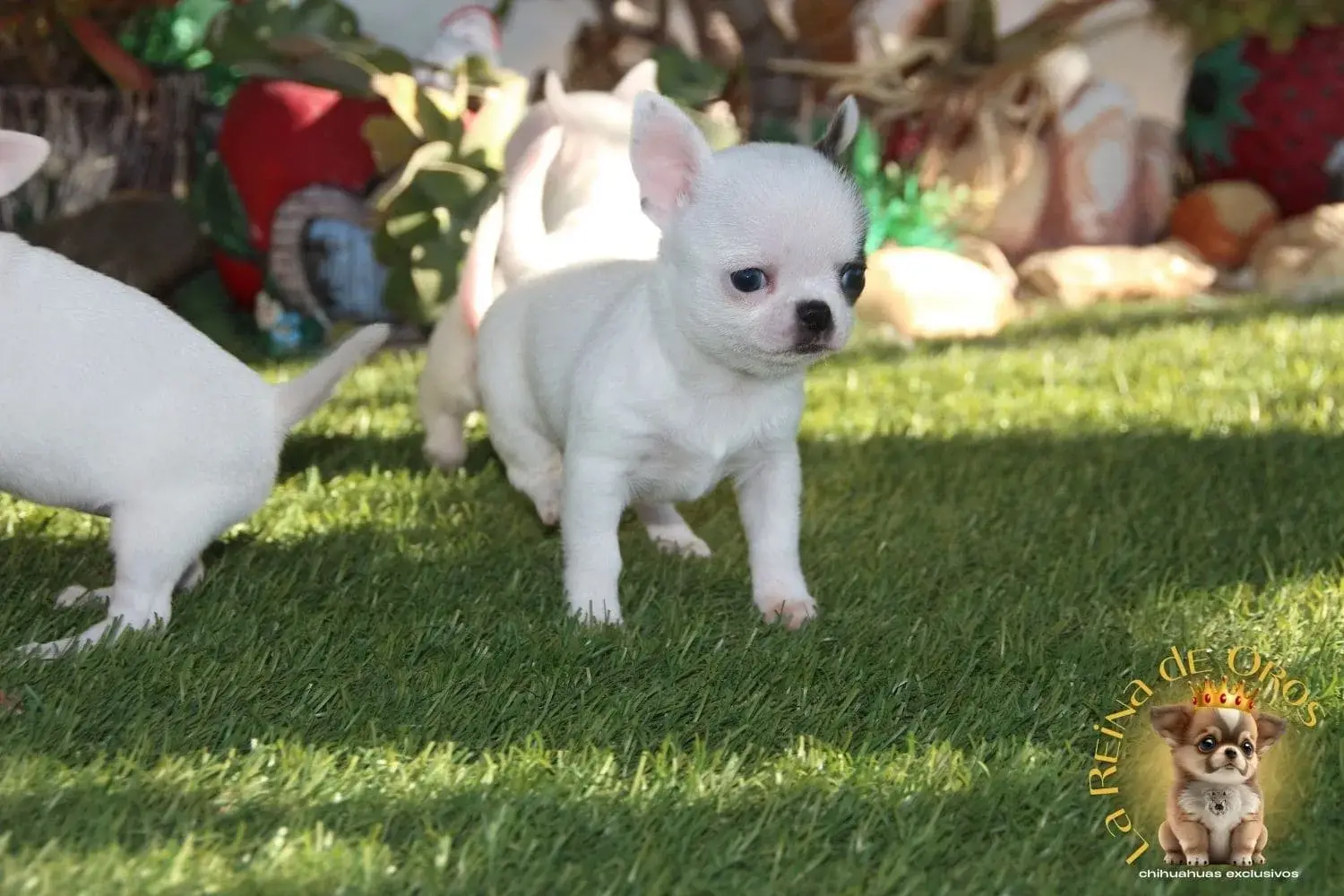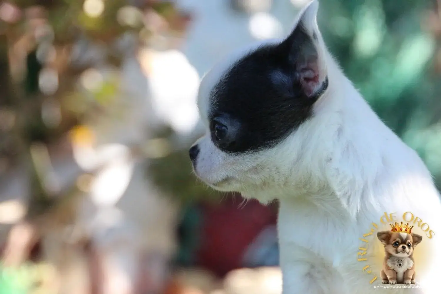 Cachorro Chihuahua Cookie de La Reina de Oros, así me llamo, y he llegado al mundo con una luz que no pasa desapercibida. Soy una hembrita blanco‑azul, pequeñita como un susurro, pero con una mirada que siempre parece estar tramando algo dulce.